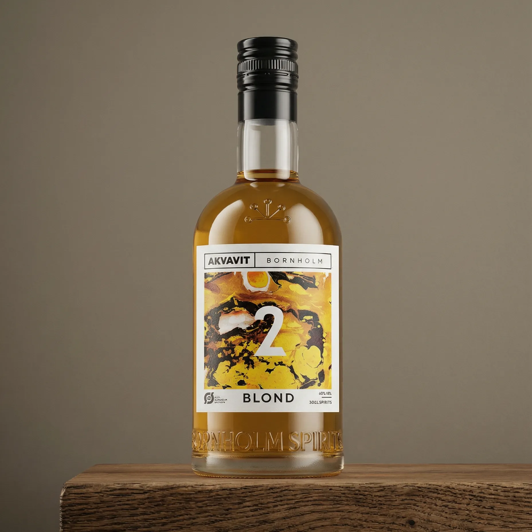 Blond gylden akvavit Blond er vores bud på en økologisk gyldenblond akvavit. BLOND Akvavit er fremstillet i Nexø på Bornholm, – skabt af økologisk hvede og lokalt vand, som har lagret på mineralsk klippegrund i milliarder af år. Forenet giver det akvavitt